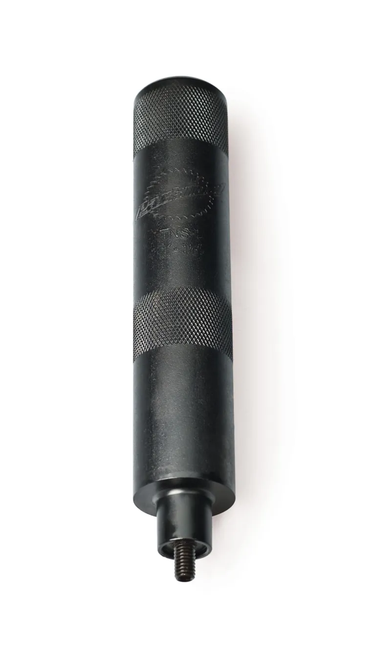 The Threadless Nut Setter is used to install star-fangled nuts found on threadless headset systems. Thread the nut onto the TNS-1, insert into the fork stack, and tap it in with a hammer. Sets the starfangled nut to 15mm and keeps it straight. Long handle helps prevent pinched fingers.