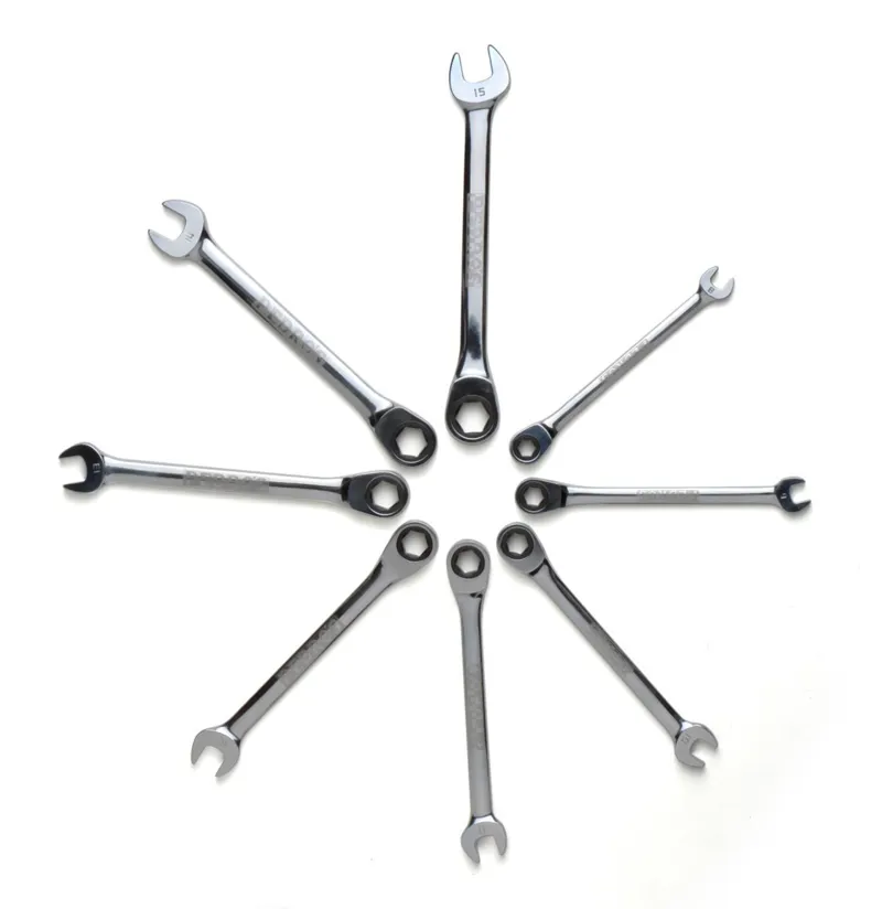 The Pedro's Ratcheting Combo Wrench Set features beautiful, compact, and durable spanner wrenches. The forged and polished wrenches feature a convenient combination of six point ratchet box-end and offset open-end.