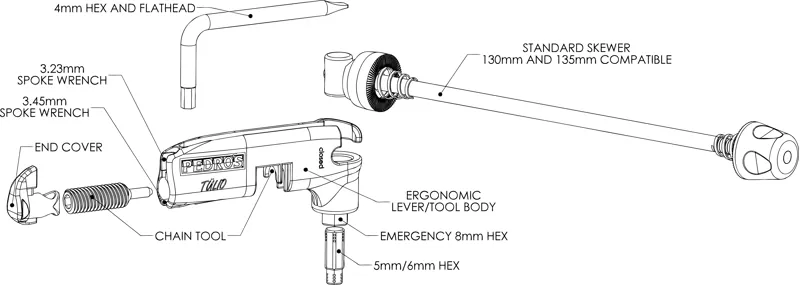 This is a multi-tool like no other. The Tülio Q/R Skewer Multi-Tool replaces standard 130mm and 135mm rear quick release skewers and provides an integrated 8-function sub-60 gram multi-tool.