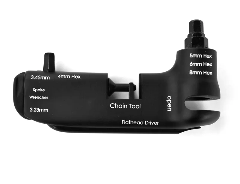 Eight tool functions include 4mm, 5mm, 6mm, and 8mm hex wrenches, flathead screwdriver, 1-11 speed compatible chain tool, and 3.23mm and 3.45mm spoke wrenches.