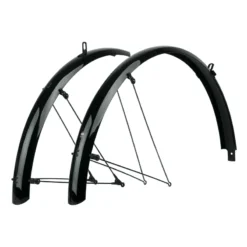 The smart, double hinged quick release fitting system also fits aero forks and is compatible with disc brakes. Mudguards can be perfectly adapted to the radius of the wheel by adjusting the length of the stays. Superlight extra long mud flaps give additional spray protection. Includes adhesive protection kit to avoid damaging the paintwork.