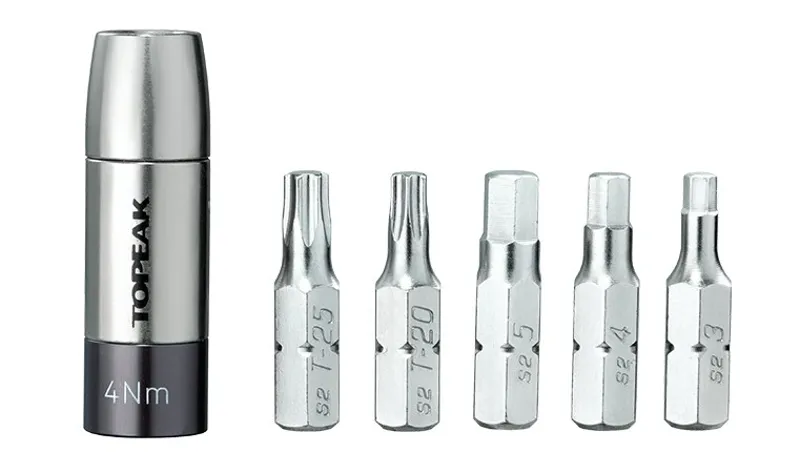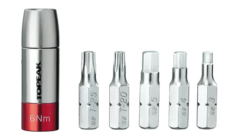 This preset torque socket (4Nm/5Nm/6Nm) kit will work with any mini tool containing a 5mm Allen wrench (or single 5mm Allen wrench) to apply correct torque values on component bolts for safety and to prevent damage to expensive carbon parts. A carry case neatly stores one preset 4 Nm (5Nm or 6Nm) and the 5 most popular tool bits (3/4/5mm hex & T20/T25 Torx).